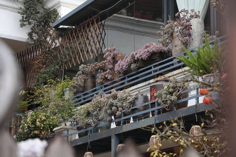 寒意尚浓,园中却处处涌动着破土而出的鲜活绿意。这绿意从蓝灰的栏杆、米白的墙面、红棕的木架中悄然浮起,顺着檐边一串串垂落的佛珠吊兰缓缓淌下,一丝一缕,由半空绵延至地面。地面上,一团团多肉顺势铺展,嫩粉、浅绿、淡紫交织晕染,透出生命特有的丰盈。这份饱满,自然而然地漫向一面经过改造的旧红砖墙,墙面深浅不一的壁龛内,旧陶瓮与素瓦罐默然静立,多肉栖息其间,自在生长。绿意还在蔓延,转而从错落的原木花架垂下,从废弃的旧木槽涌出,从悬空的竹篮边淌落,在缠绕堆叠间,汇成一片立体的、起伏的、汹涌的春潮。